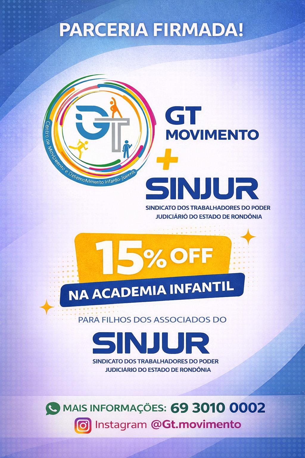 O SINJUR agora conta com parceria com a GT – Centro de Movimento, que oferece 15% de desconto para todos os filiados.