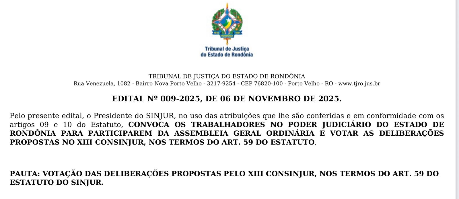 A Assembleia em questão ocorrerá no dia 12/11/2025, com primeira chamada às 08h30 e segunda chamada às 09h00, no Auditório Fábio Alcaraz Delgado, sede do Sindicato dos Trabalhadores no Poder Judiciário do Estado de Rondônia - SINJUR, situado na Rua Venezuela, n. 1082, Bairro Nova Porto Velho, com transmissão em tempo real via YouTube.