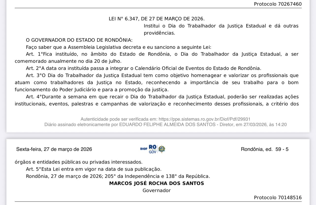 O SINJUR (Sindicato dos Trabalhadores do Poder Judiciário do Estado de Rondônia), com apoio do gabinete da deputada estadual Cláudia de Jesus, celebrou a sanção da Lei nº 6.347, de 27 de março de 2026, que institui o Dia do Trabalhador da Justiça Estadual, a ser comemorado anualmente em 20 de julho.